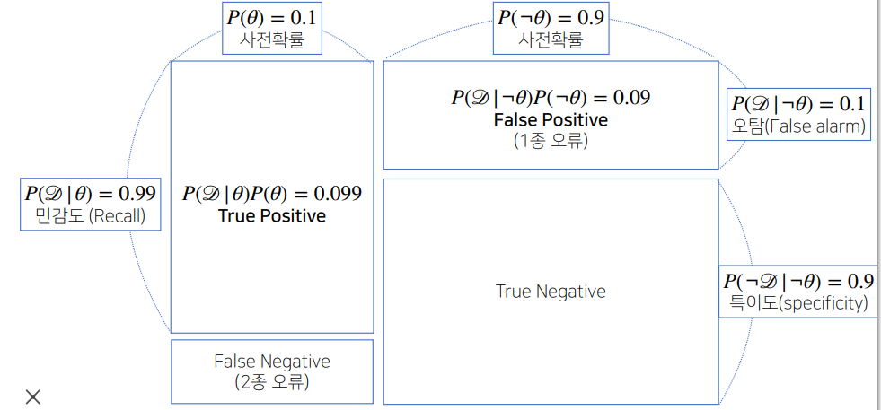 $P(D|not \theta)$ = 0.01 (오 검진 확률 1%, False Positive, 거짓 양성, 제1종 오류)