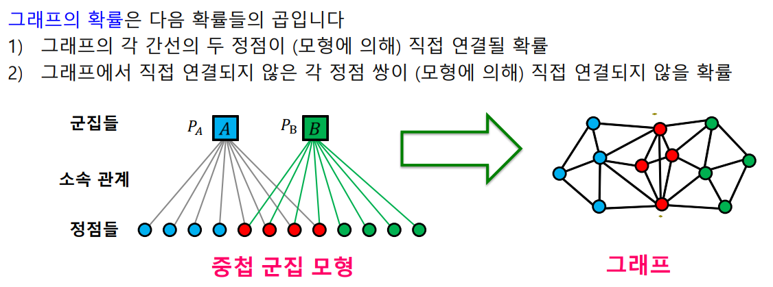- 두 정점이 여러군집에 동시에 속할 경우 간선 연결 확률은 독립적이다.