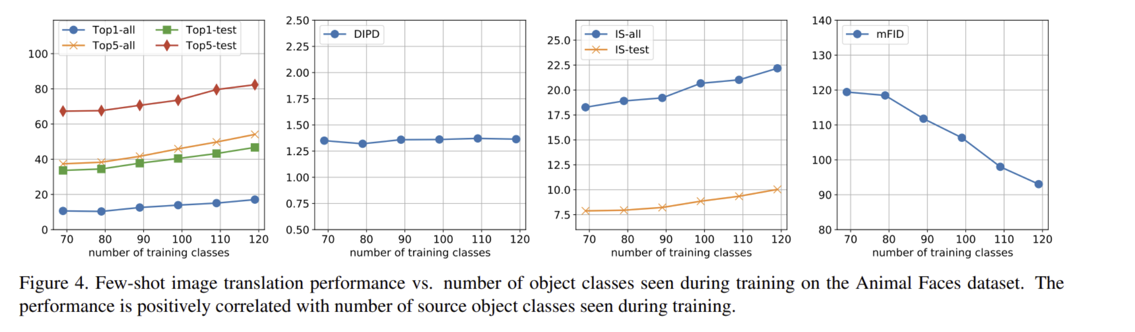 - target class의 데이터가 부족한 few-shot 상황에서 성공적으로 translation, 데이터가 많아지면 그에 따라 결과물의 퀄리티가 향상됨을 보임