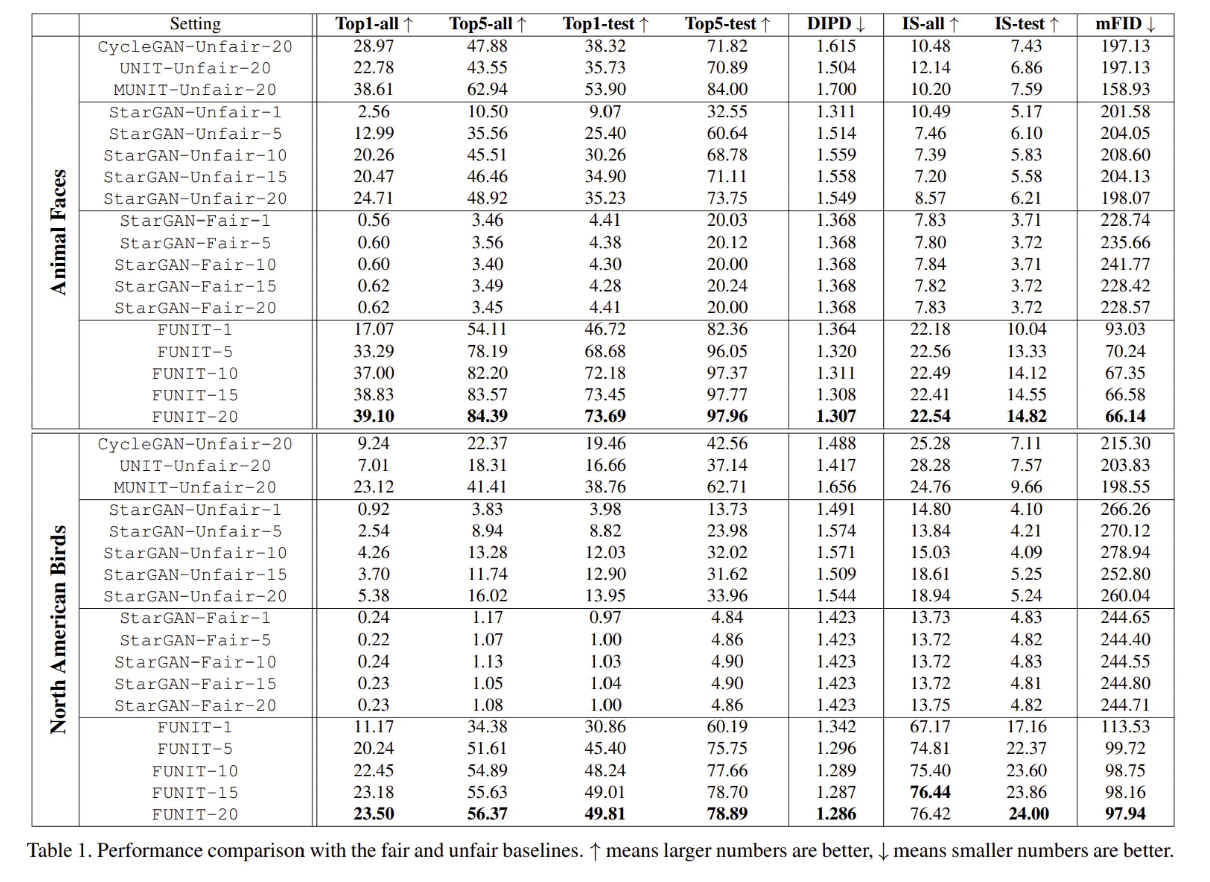 - [Table 1]을 보면 FUNIT은 다른 few-shot unsupervised image-to-image translation baseline의 성능을 뛰어넘은 것을 알 수 있음