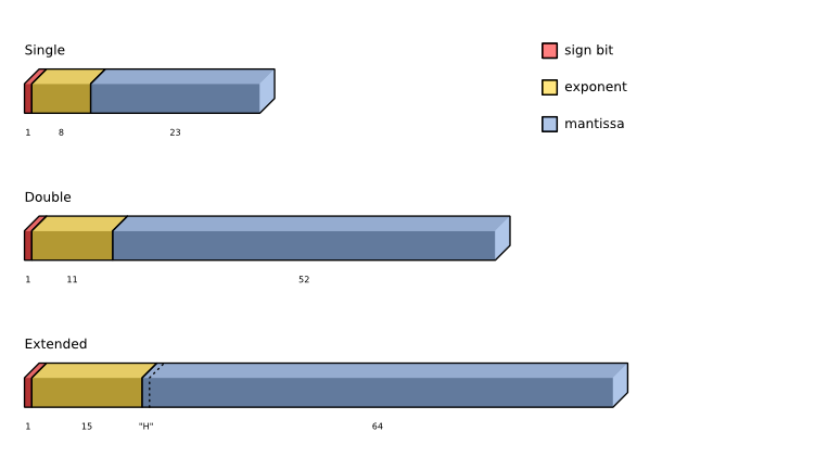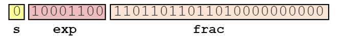 노란색 부분은 지수 부분 (Exp, exponent)이며 파란색 부분은 가수 부분(fraction, Mantissa)이다.