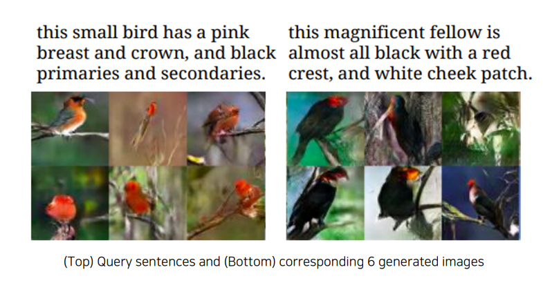 학습이 완료되면 text 데이터를 입력하면 이를 바탕으로 이미지를 생성하는 GAN 모델이 완성된다.