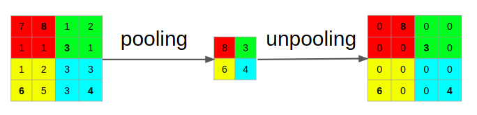 pooling layer를 통과할 때 대표값으로 선정된 index를 저장하고 unpooling layer를 통과할 때 다시 저장된 index에 맞게 값을 배치해준다.