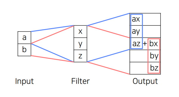 위의 2개의 그림을 보면 이해가 쉬운데 input값이 filter의 값과 곱해져 각 위치의 output값이 계산된다. convolution layer에서 input에서 하나의 pixel이 여러 번 filter에 의해 계산이 되는 것처럼 Transposed convolution layer에서는 input이 아닌 output이 겹쳐서 나오게 되고 이는 더하여 계산한다. (위 그림에서 az+bx)