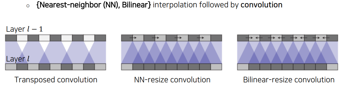 output에서 특정 pixel은 합하여 계산된 값을 가지기 때문에 위와 같이 kernel size=3, stride=2 인 Trasposed Convolution이 이루어질 때 4개의 값이 합쳐진 짙은 검은색 부분, 2번 값이 합쳐진 회색 부분과 같이 마치 Checkerboard모양으로 output이 나오게 된다.
