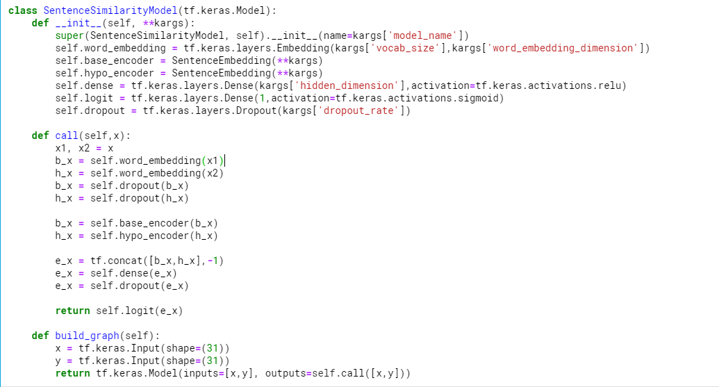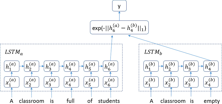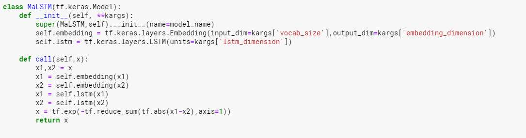 위와 같이 2개의 문장의 각 token을 Embedding 한 x를 input으로 하는 LSTM layer의 마지막 unit의 state의 Manhattan거리를 측정한다.