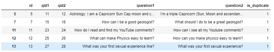 위와 같이 train 데이터는 2개의 질문인 question1, question2와 label인 is_duplicate로 이루어져 있다.
