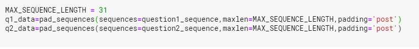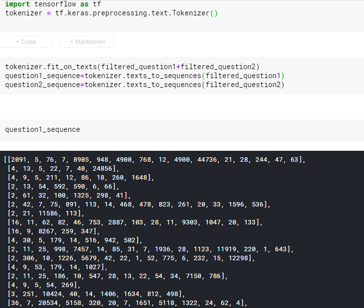 TF2의 keras의 Tokenizer를 question1, question2를 이어 붙인 list에 fitting 시켜 생성된 word index를 바탕으로 sequence로 변환한다.