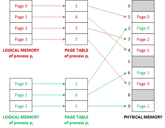 Page의 번호와 물리 메모리의 시작주소를 저장하고 있는 Page Table을 사용하여 Logical memory의 Page의 Physical Memory 주소 값을 알 수 있으며 이를 통해 알맞은 위치로 매핑이 가능하다.